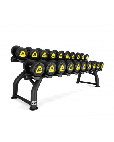 Розроблена з урахуванням універсальності, ця стійка має плоскі полиці без сідловидних упорів, що дозволяє використовувати як гантелі ZIVA XP Hex, так і ZIVA SL Hexagon.