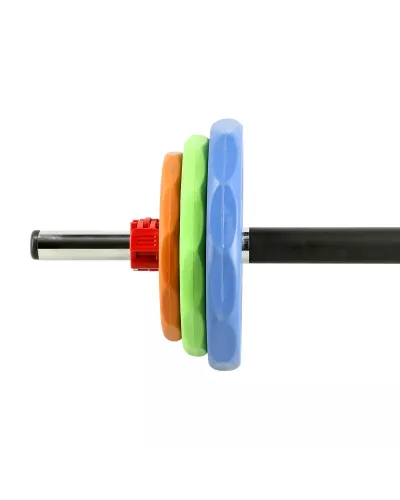 Набір складається з грифу, 6 кольорових пластин, покритих гумовим покриттям, та двох терміналів. Довжина штанги становить 140 см, а її діаметр – 30 мм. Вона виготовлена із міцної хромованої сталі, з підвищеною зносостійкістю.