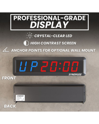 Настінний інтервальний таймер Synergee Premium має кристально чистий світлодіодний дисплей з високою контрастністю. Цей професійний таймер для тренувань ідеально підходить для домашнього або комерційного тренажерного залу. Яскраві червоні та сині цифри легко побачити з усіх куточків вашого тренувального простору. Ці цифри чудово підходять для відліку часу між раундами, відпочинку або для того, щоб змусити вас викластися на повну, щоб побити свій часовий ліміт!